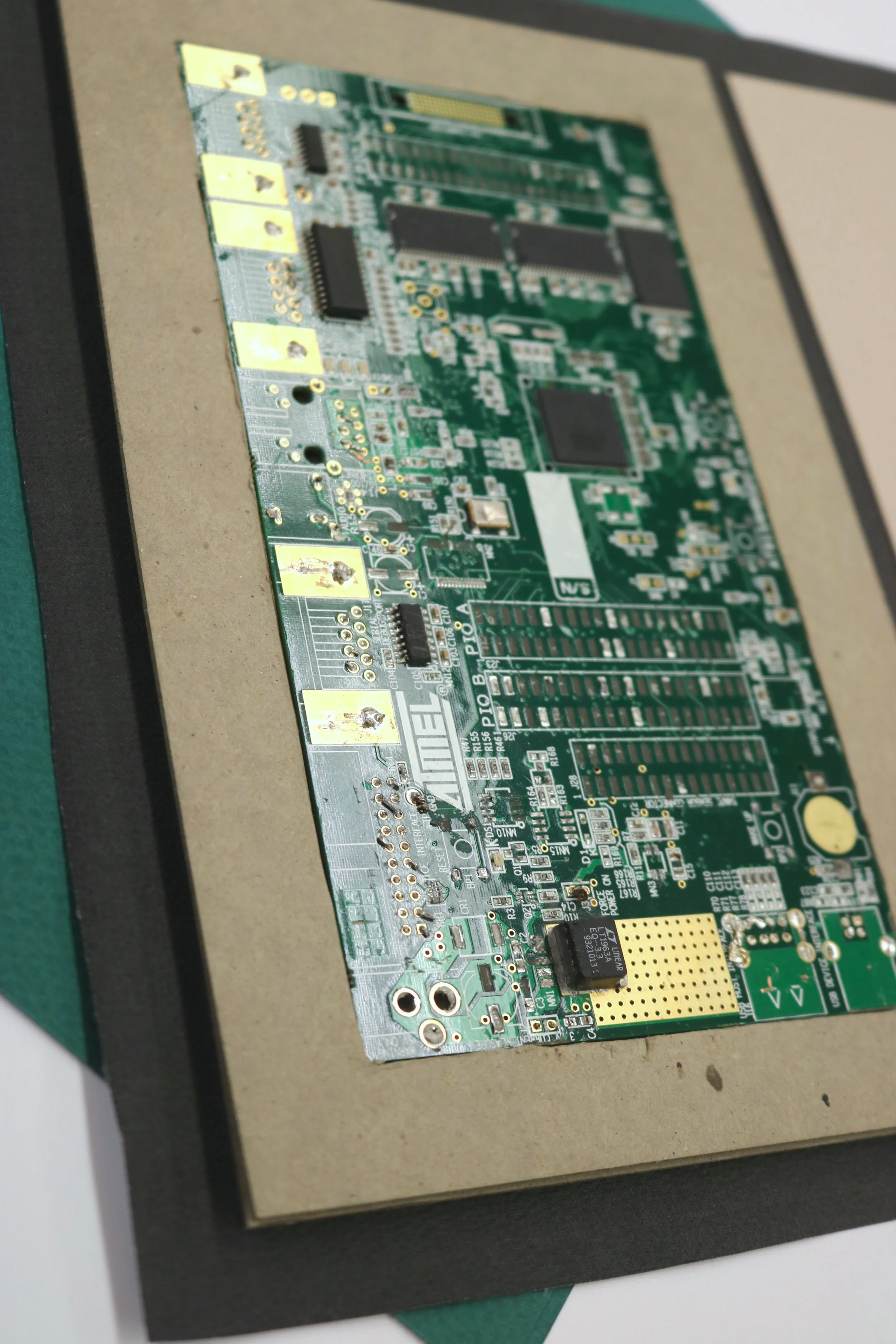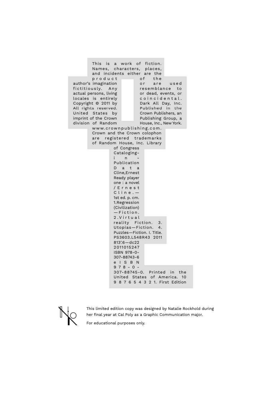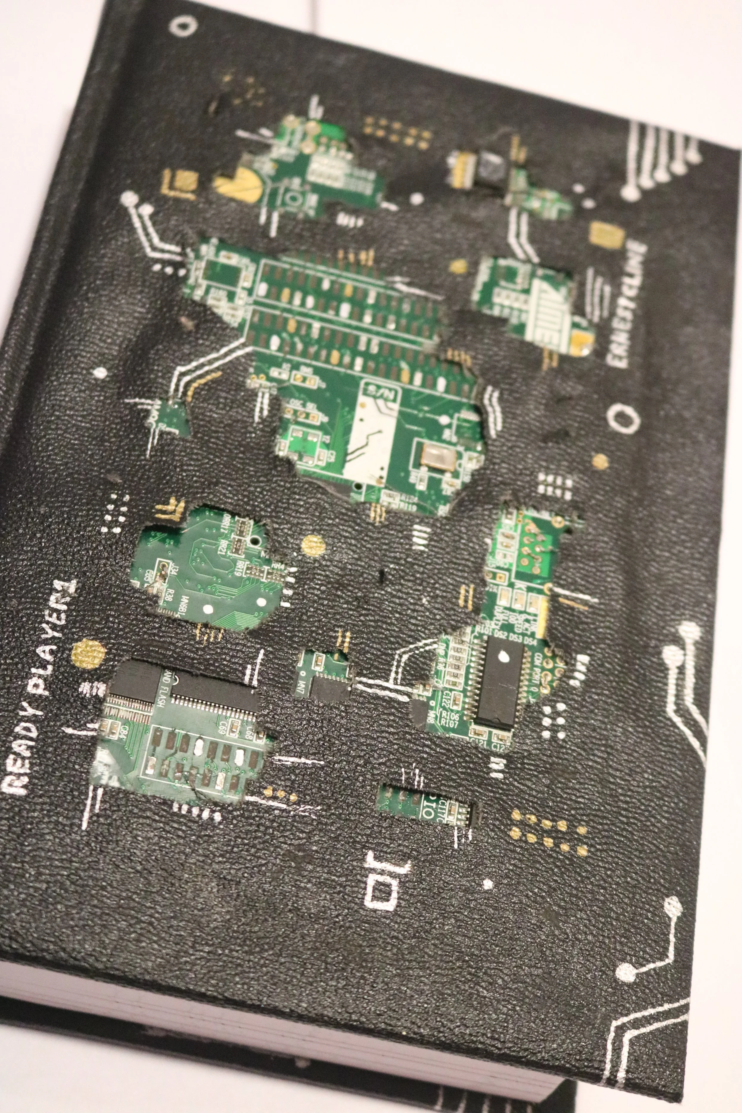 Design, printing, cutting, sewing, gluing, binding, and decoration of a limited edition copy of Ready Player One by Ernest Cline. Printed on the Konica Minolta AccurioPress c12000. Cover and page decorations inspired by motherboards and retro electronics. Given that the book takes place in a post-apocolyptic Earth ravaged by climate change, special consideration was given to using found material. View the book’s full design by clicking on the inside cover art.